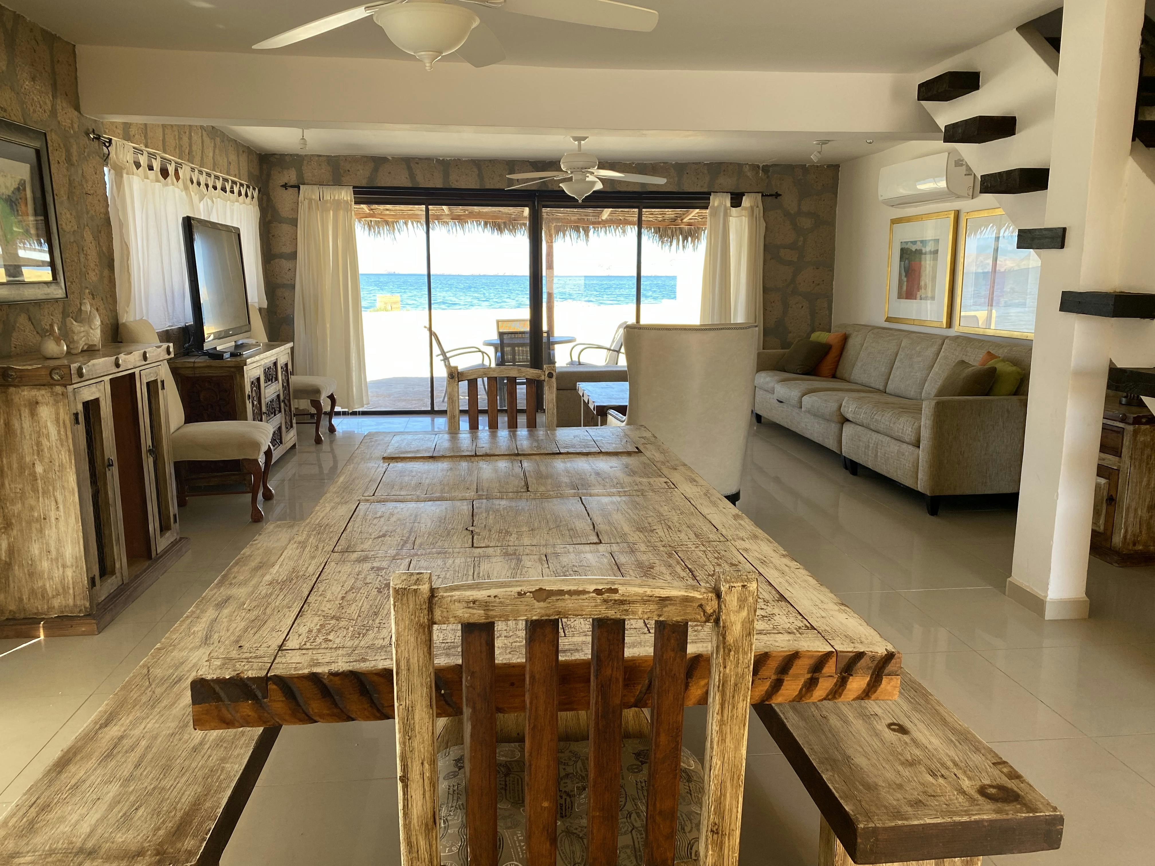 Planta baja: terraza con vista al mar, sala (con sofá cama king) comedor cocina, baño completo, recámara con 2 camas Queen y baño completo