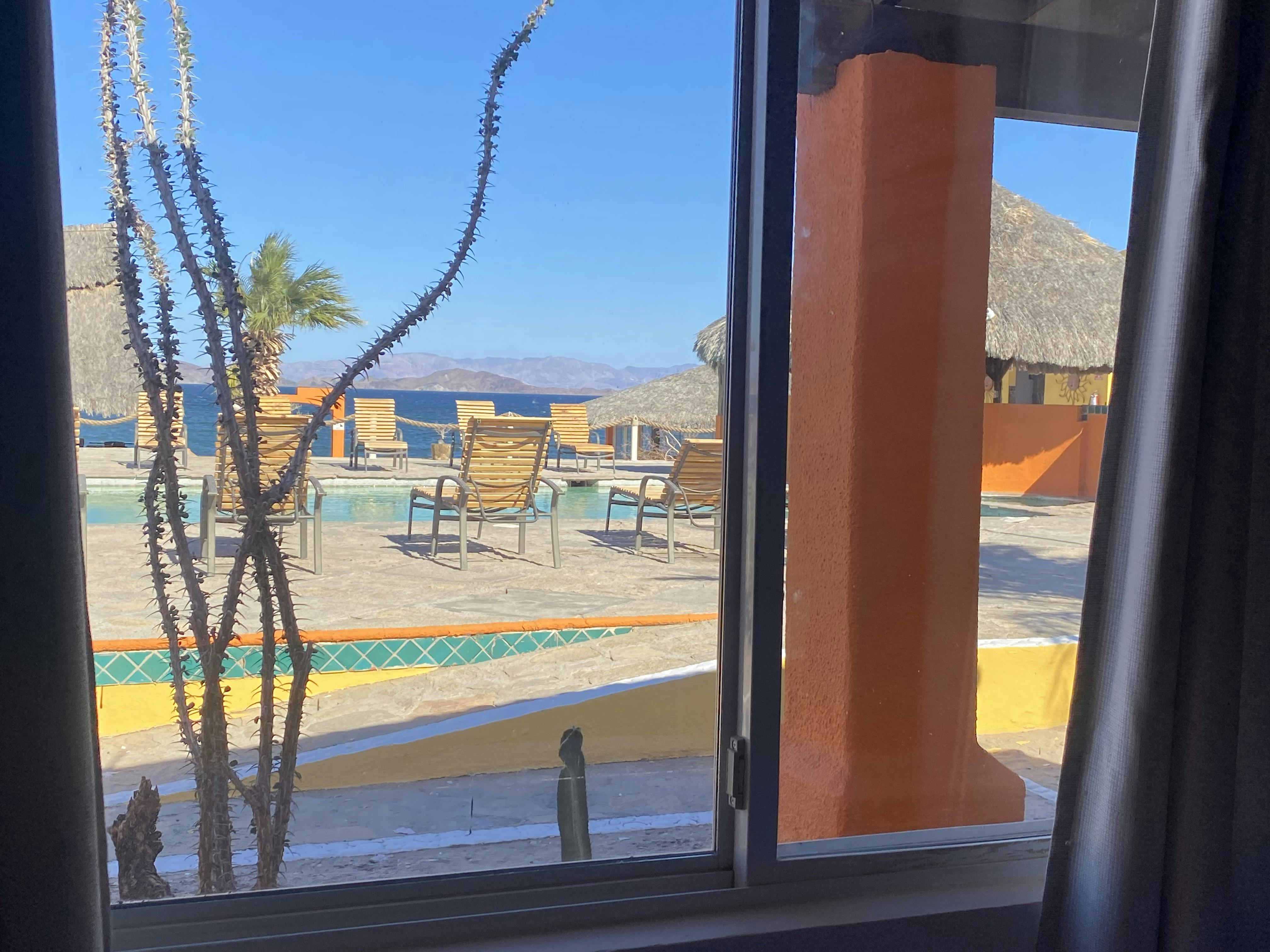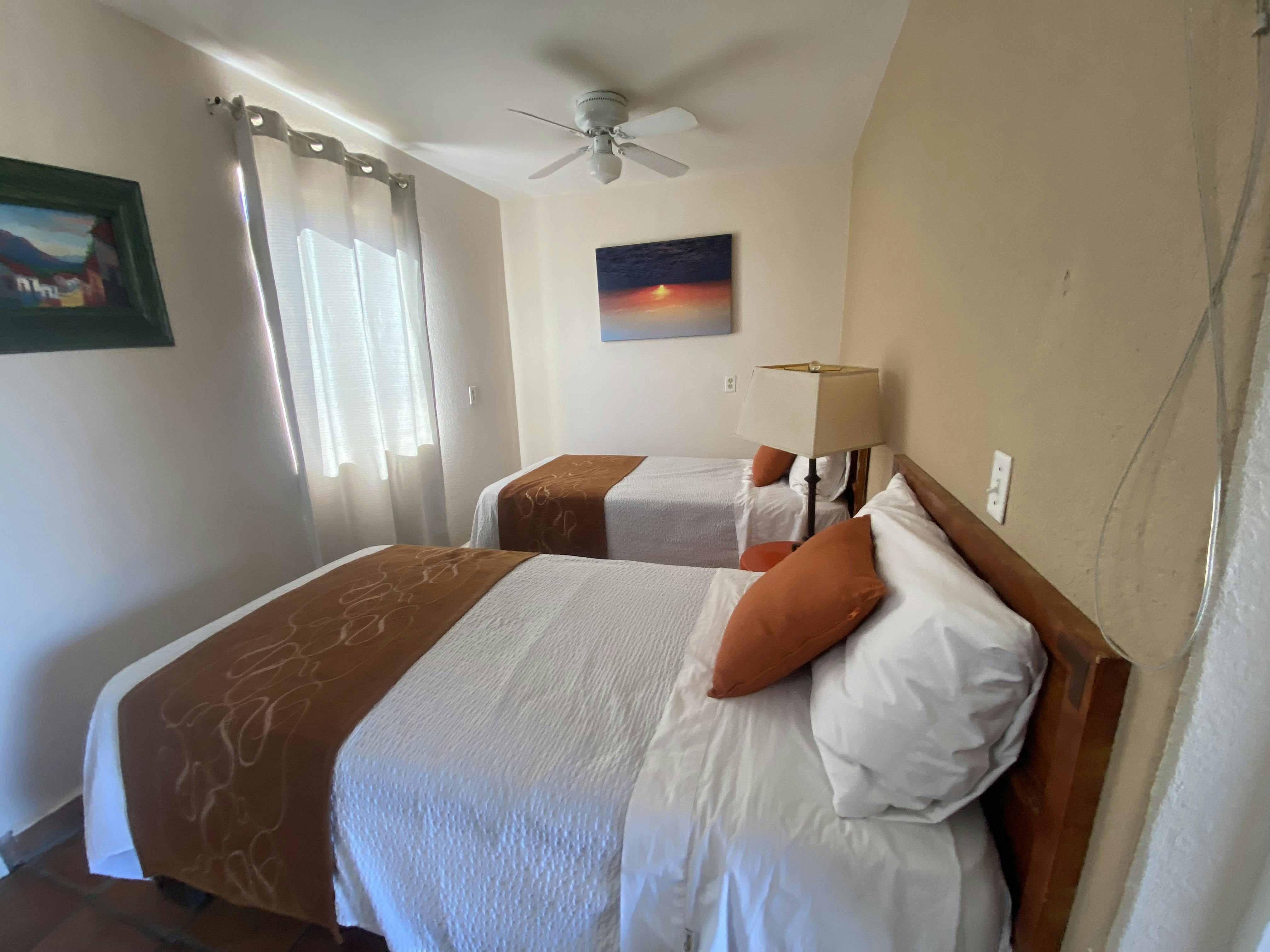 Bungalow con una habitación cerrada con cama matrimonial, una habitación abierta con 2 camas individuales, un baño y todo da a una estancia con un sofá cama matrimonial, un armario con caja fuerte, y cafetera, esta frente a la alberca